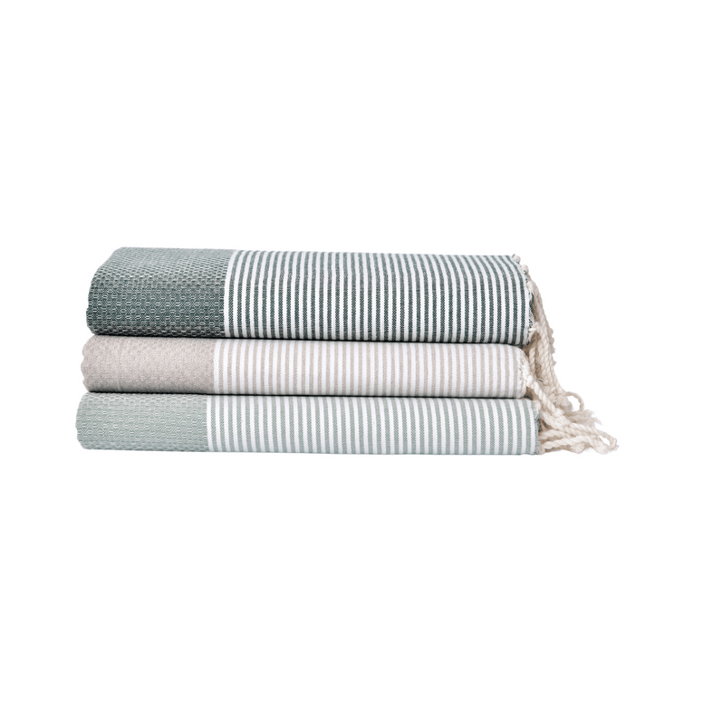Bring an atmosphere of tranquility and sophisticated style to your space with our Honeycomb Tranquility collection. This set, in rich dark green, calming sage green, and neutral cream, captures the essence of a peaceful forest canopy and the soft, muted tones of nature. The honeycomb weave adds a luxurious texture that not only looks beautiful but also feels delightful. Whether for a moment of solitude or to share comfort, these foutas are a testament to a tranquil life and sophisticated taste.