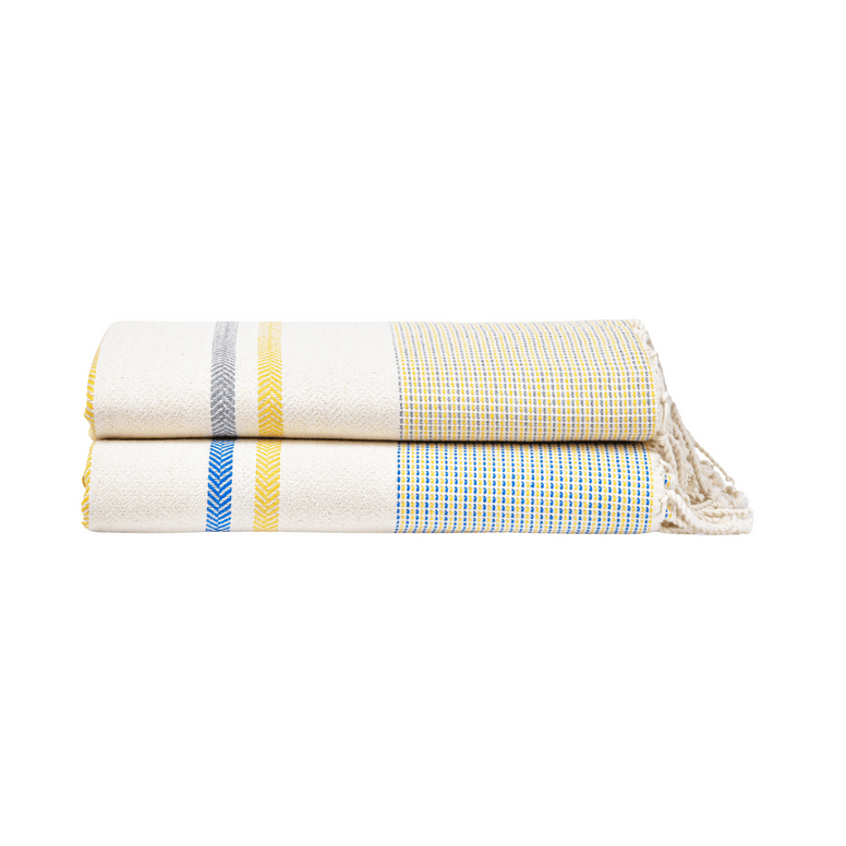 Experience the heritage of the Amazigh people with this " Amazigh " fouta set, where each weave tells the story of an ancient tradition. Decorated with geometric patterns in earthy tones and vibrant blues, these foutas add a cultural touch to your beach or sauna visits. They combine exceptional absorbency with the timeless craftsmanship of the Berbers.