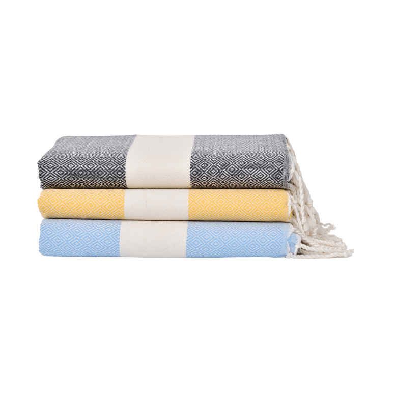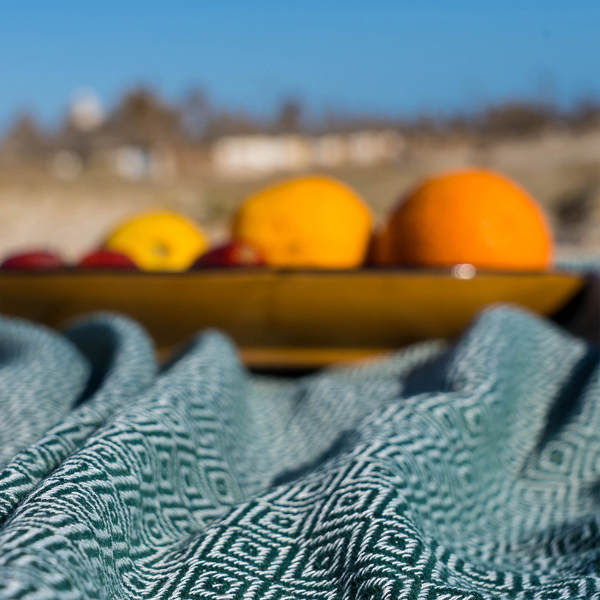 100 % Baumwolle (Fouta-Webart), weich, saugfähig und langlebig.